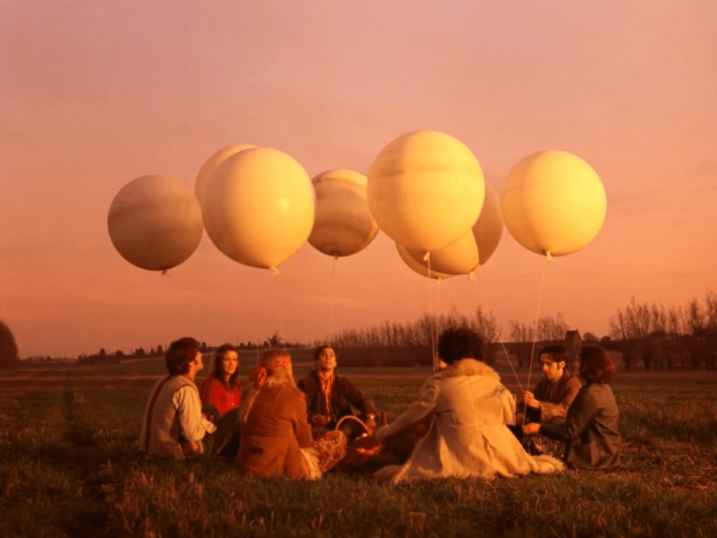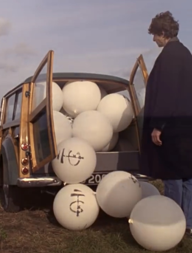 The white balloons, with the Pink Floyd’s boatman logo printed on them, represent Pink Floyd fans, and the man opens the back of the vehicle and releases them. And the balloons go down a path to the castle. He can’t go to the castle, so he sends the fans to learn the truth. The balloons bounce down the path and go right into the castle.