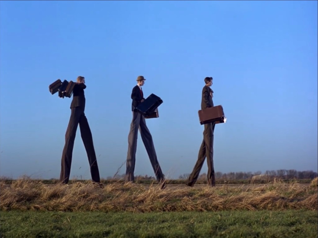 Also in the video for “High Hopes,” you see three people in suits on stilts walking away carrying suitcases as if they’re leaving for good. The third person is made up to look like a young boy, perhaps representing “the golden boy” from the song “Poles Apart.” Do they represent ELP?