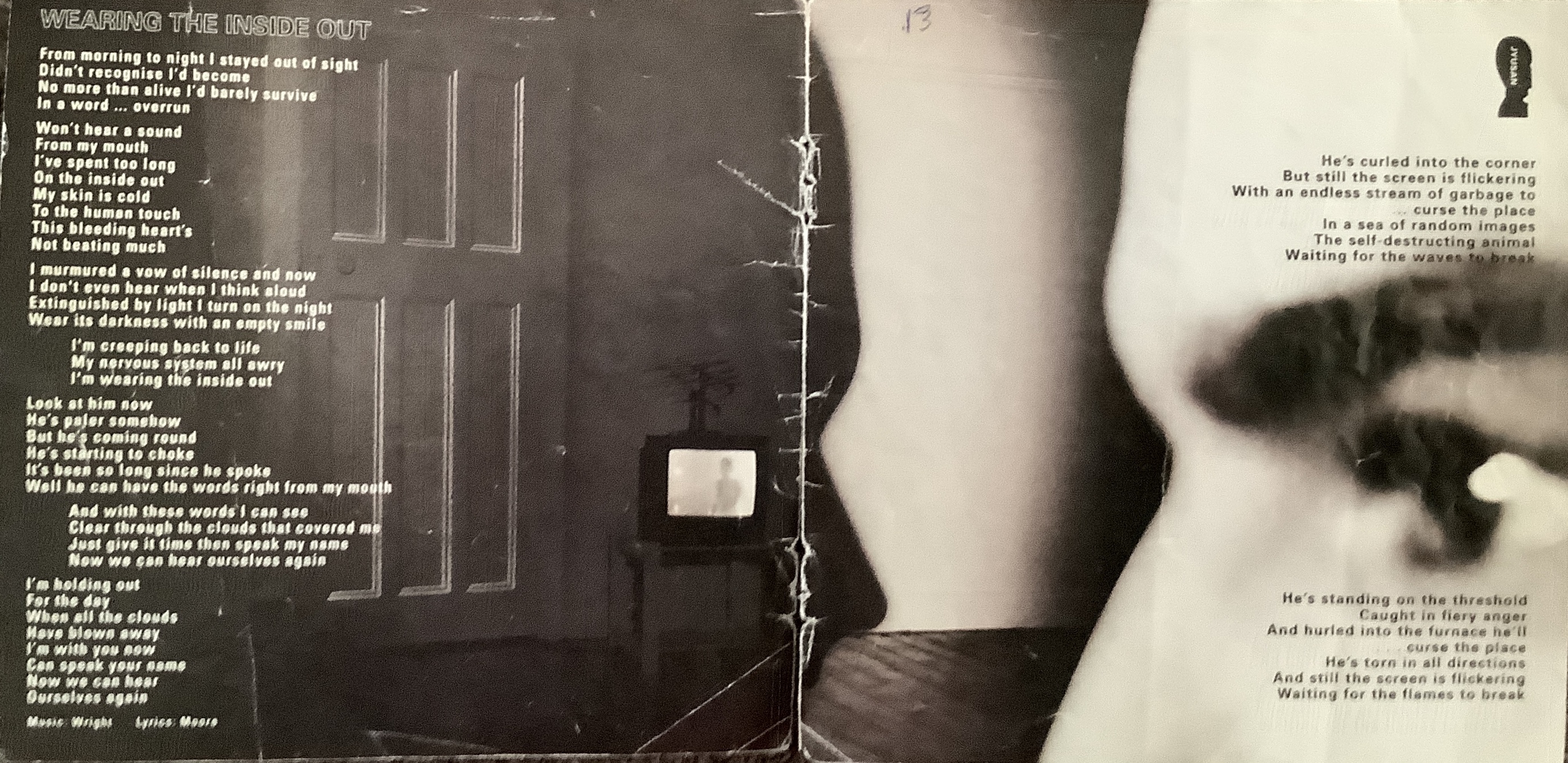 The lyrics from “Wearing the Inside Out” represent words from different people. The words that Rick sings convey my words as I think aloud. Gilmour, with the backup singers, is talking about Carl and calling him the “self-destructing animal.”