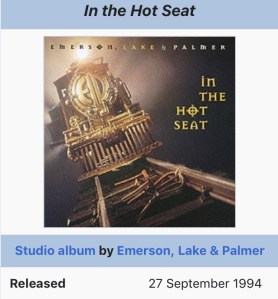 Emerson Lake & Palmer released their last album, In the Hot Seat, in September of 1994. I didn’t even know about it at the time. I never cared to listen to it. Who were they putting in the hot seat?