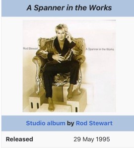 On May 29, 1995, Rod Stewart’s Spanner in the Works was released. It was incredible how beautiful and inspirational the songs were, and still are, to me. I believe Gilmour told Stewart what was going on and how I needed more help as I was still being stalked and harassed. (I wrote about hanging out with Rod Stewart and Faces in Chapter Two). So now it was like more old friends had come back from my past to help me out.