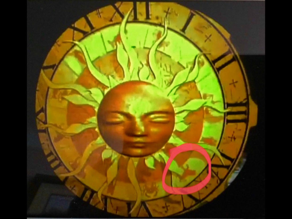 In the YouTube video of “Time” during The Division Bell tour, the wheel is shown flat, and the lion flies off it, and you see the letter C, and the sundial with the lady’s face appears. That’s the artwork that shows one sun ray intentionally clipped to reveal an image of a lion.