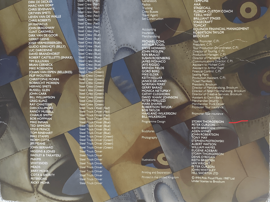 Also, on the back of the 1994 American tour guide, you see the three flags artwork again. What is on the other side of the page directly opposite of the missing man? The name Storm Thorgerson. You need a bright light to see through the page, as it is thicker.