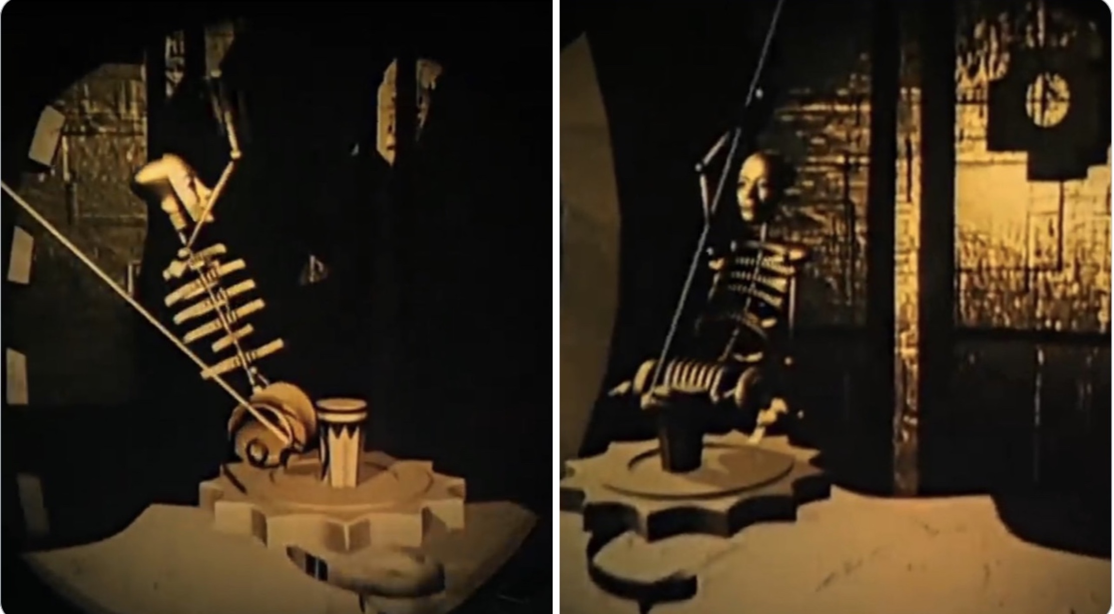 You can see a long wire with a crescent-shaped C at the end of it, and it’s connected to the mechanical drummer, and he is wearing a mask. And then, as he turns and falls backward, the timekeeper has a woman’s face. Carl Palmer wore a mask when he played with Arthur Brown, and I was a drummer at one time.