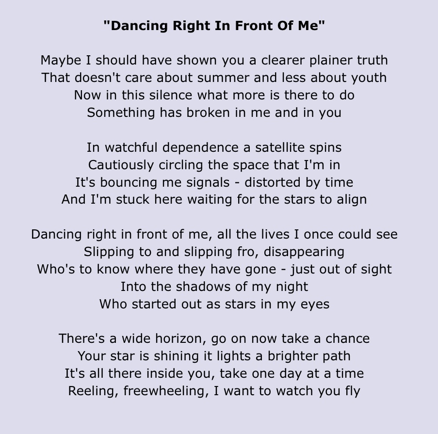 Another reason that I finally decided to write the story, was due to the song titled “Dancing Right In Front of Me”, lyrics by David Gilmour. The title immediately reminded me of the Pink Floyd concert in ‘94, when I was directly in front of him. If you’ve been reading so far, you can easily interpret his lyrics: